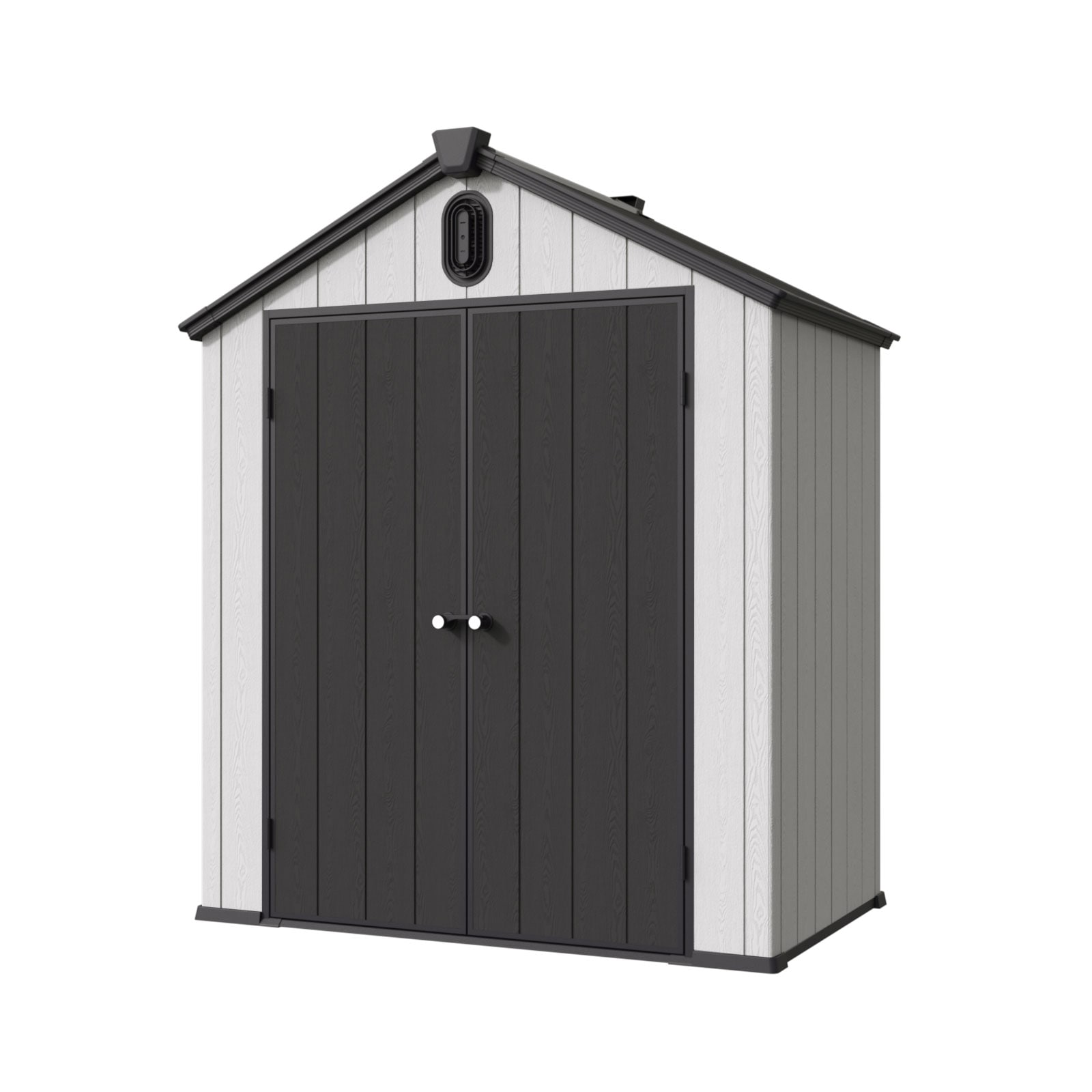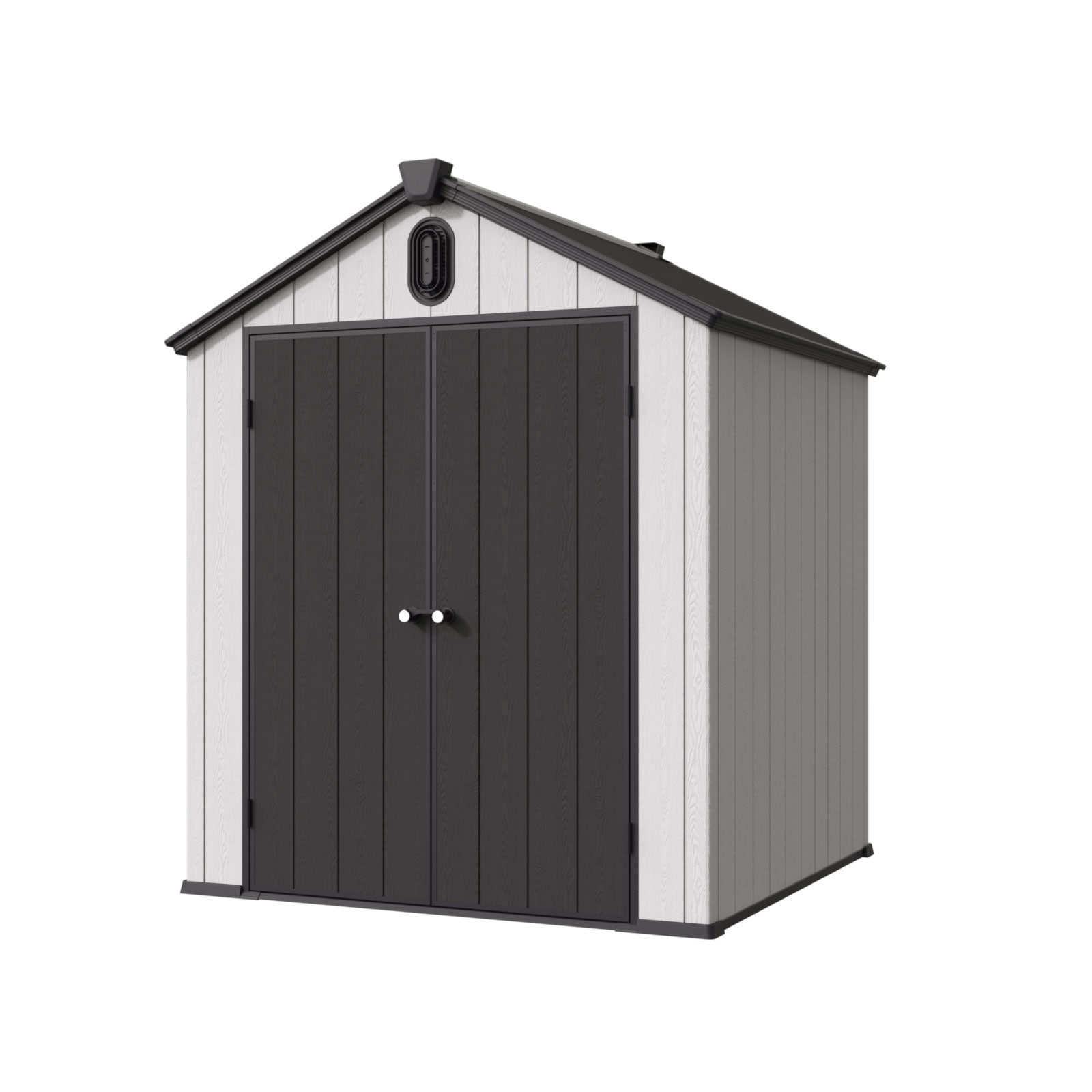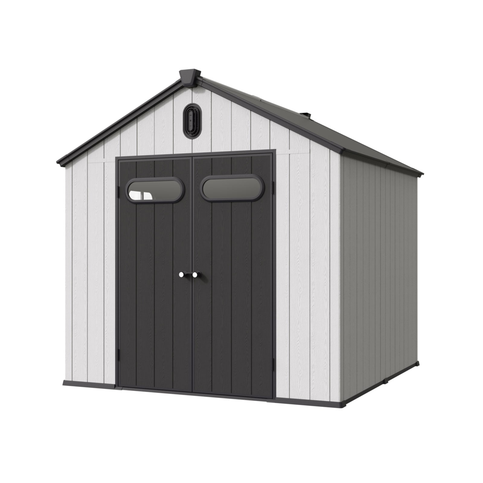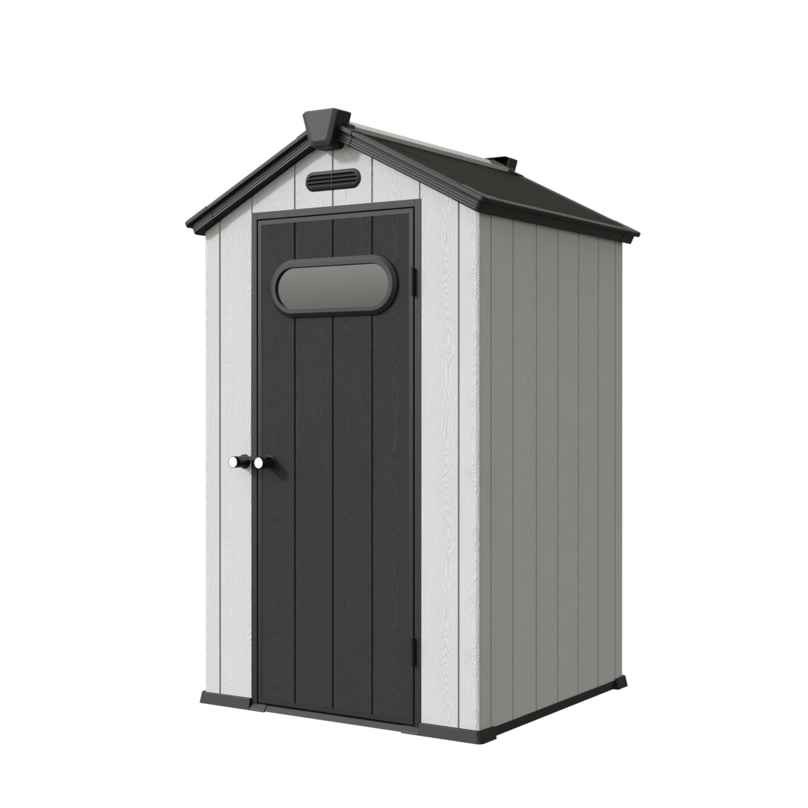 高耐久樹脂素材と錆びにくい亜鉛塗装スチール構造の強耐候性の物置。